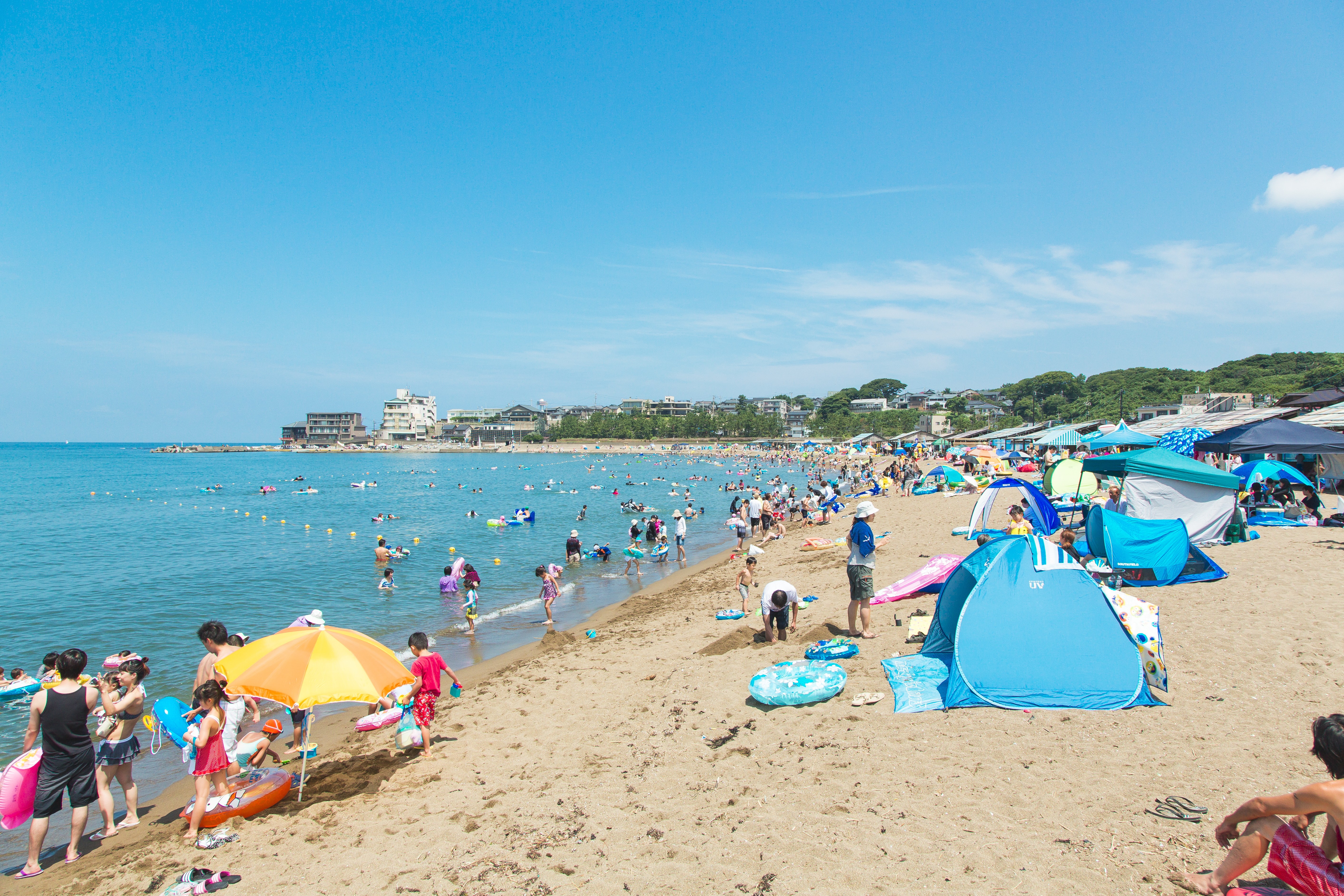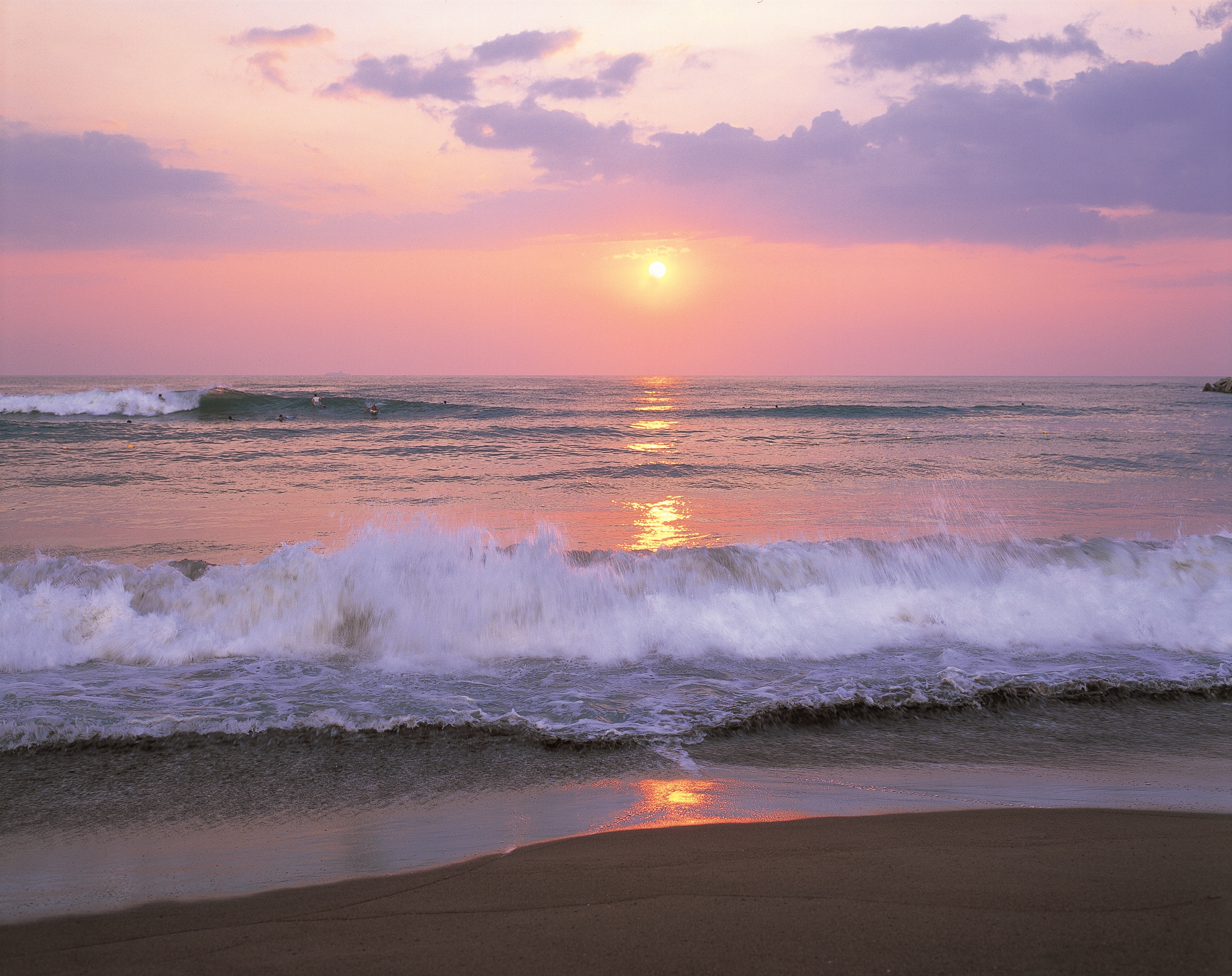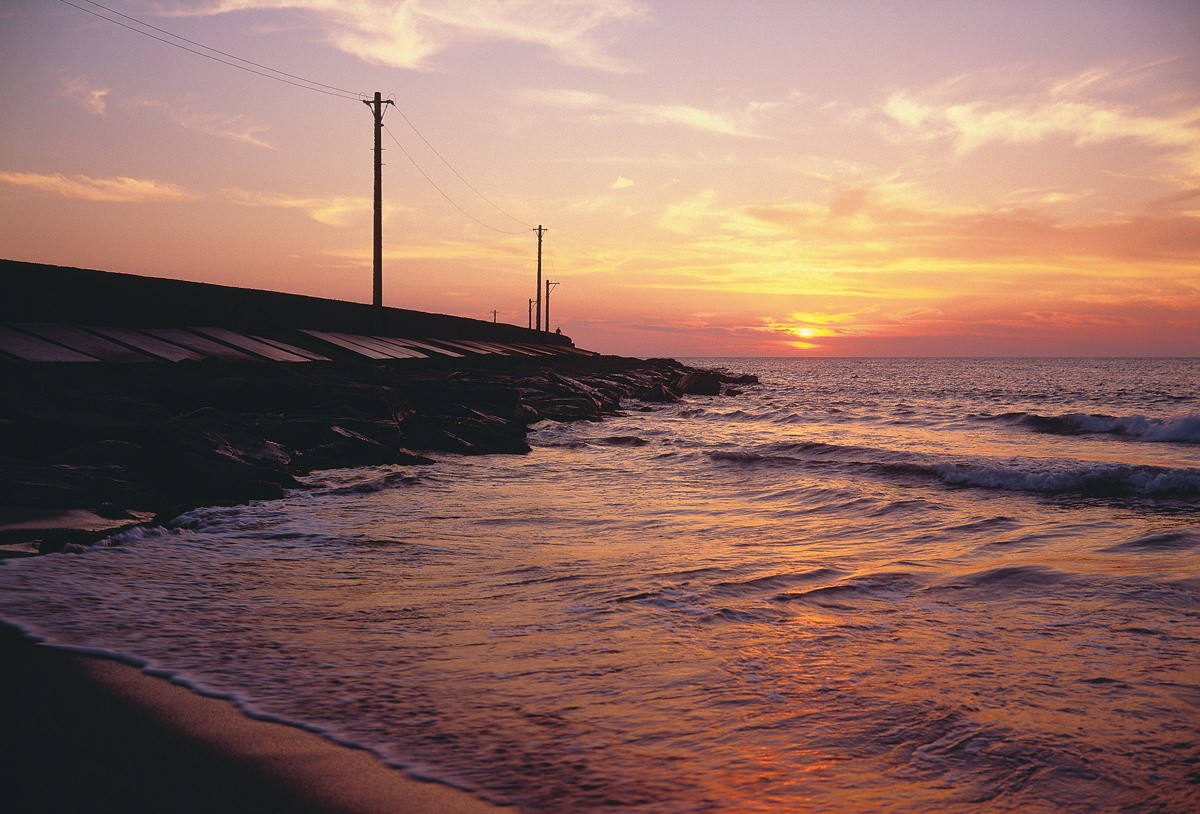 三国港の北西部に広がるサンセットビーチは、名高い夕日スポットとして知られ、遠浅で澄んだ海水が特徴の安全な海水浴場です。三国港駅から徒歩圏内という好アクセスと、周辺の充実した施設が魅力で、夏には県外からも多くの海水浴客で賑わいます。